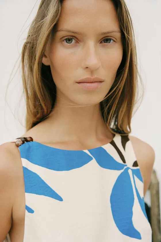 Топ из катни с цветочным принтом с бусинами Ecru / Blue | 3471/326/080