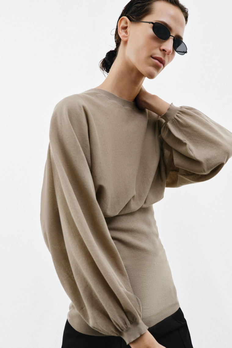 Puff sleeve top with fitted hem Beige-pink | 5755/017/942